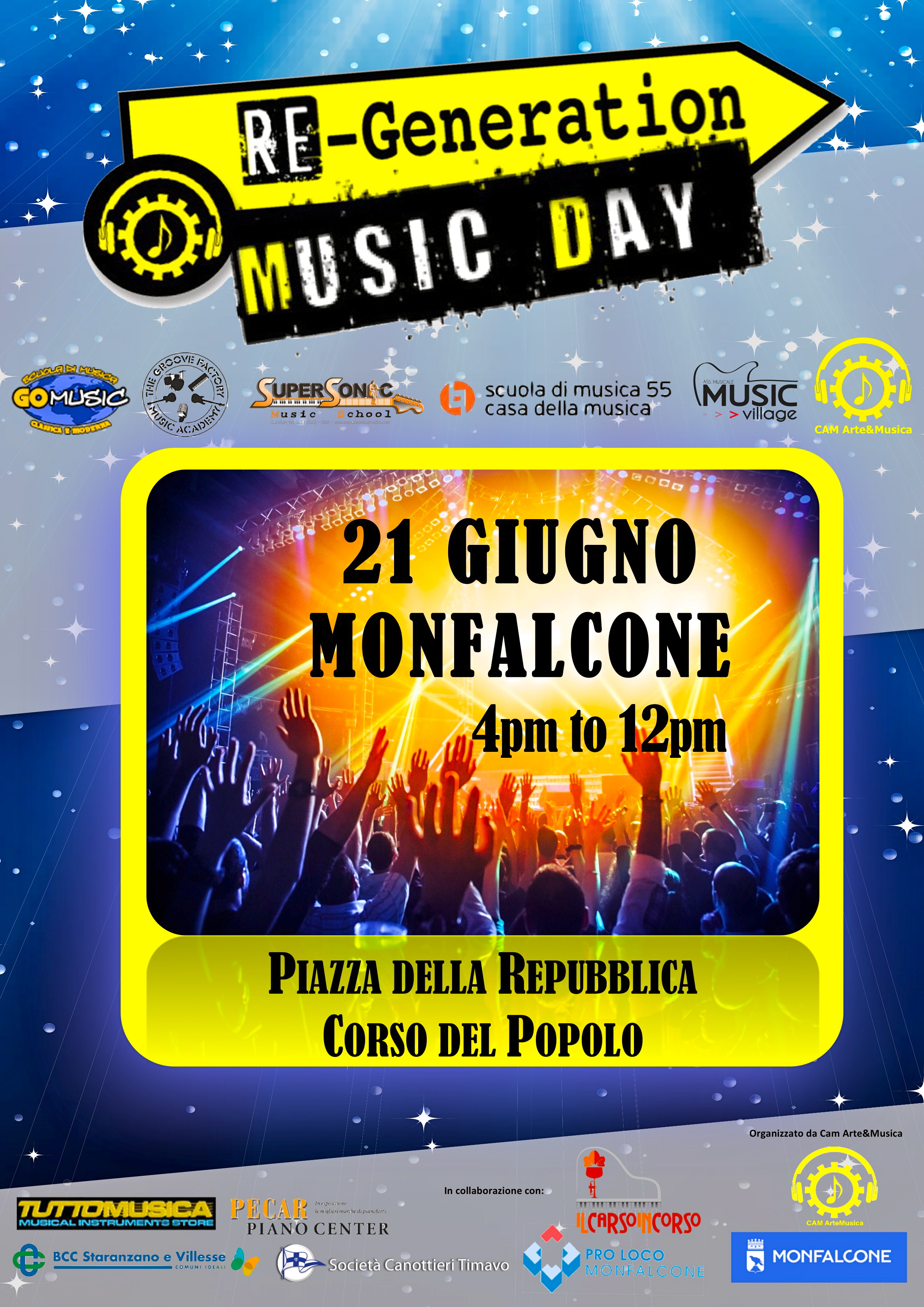 Sul palco allestito in piazza della Repubblica si alterneranno studenti provenienti dalla Groove Factory di Udine, dal Music Village di Portogruaro, Supersonic di Cervignano, Gomusic di Gorizia, Scuola 55 di Trieste e naturalmente dalla Stessa CamArteMusica di Monfalcone. Gradito ospite della giornata sarà il celebre cantautore Max Bonano. Ogni formazione avrà 30 minuti per esibirsi, e come previsto dalle regole della manifestazione europea, non sarà previsto alcuna limitazione di genere. Un altro elemento di unicità sta nel fatto che il tutto sarà gestito dal team tecnico della scuola, un gruppo di ragazzi di 16-17 anni che, sotto la supervisione della scuola stessa, e dopo oltre un anno di esperienze e tirocini in evneti e concerti, si occuperanno di tutti gli aspetti : tecnici, logistici ed organizzativi.